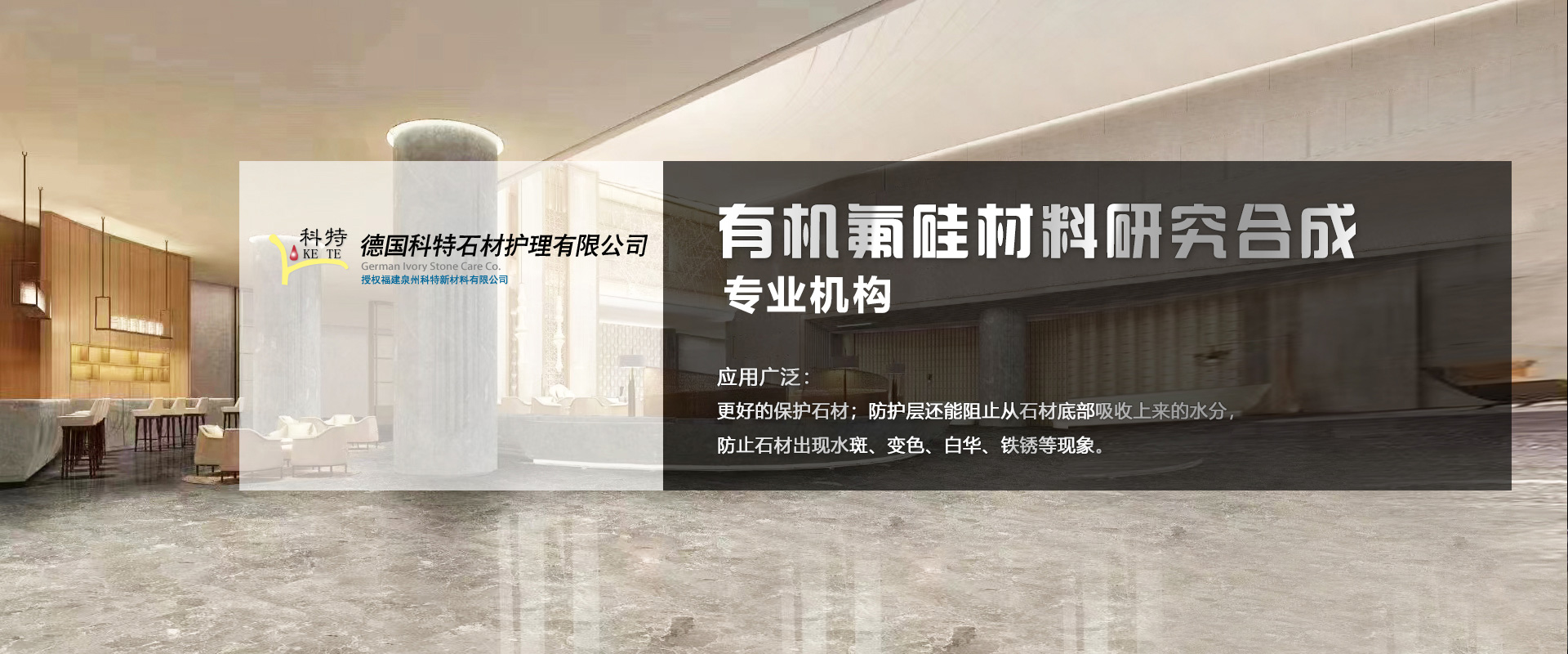 福建泉州科特新材料有限公司(Germany Kurt Ke Te)是德國從事有機氟硅材料研究合成的專業機構。對于一些吸水性基材(石材、磚瓦、混凝土),它讓氟硅元素的有效成分滲透到基材的空隙(毛細管)中,在基材內部形成一個防護層,表面達到防油效果,同時保持石材的透氣性,從而更好的保護石材。此外,防護層還能阻止從石材底部吸收上來的水分,防止石材出現水斑、變色、白華、鐵銹等現象。